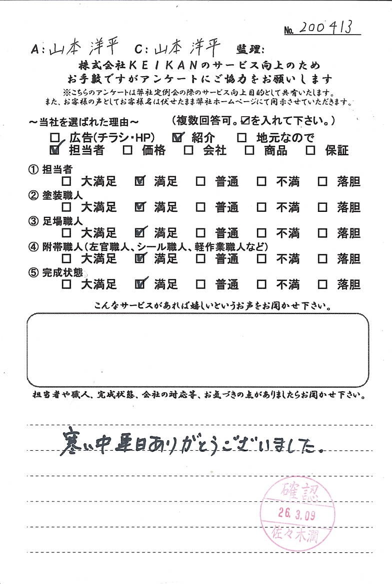※アンケート用紙をクリックすると拡大表示ができます。 ☆担当者より返信コメント☆ この度はお忙しいなか、弊社のアンケートにご協力いただき、誠にありがとうございました。 おかげさまで、貴重なご意見を頂戴することができました。 また、数ある塗装会社から弊社にご用命を賜りましたことを、大変光栄に存じております。 アフターフォローも含め、ここからが本当のお付き合いだと心得ております。 末永くご信頼をいただけますよう、全社をあげて努力してまいりますので、今後とも何卒よろしくお願いいたします。